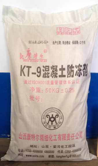 KT-9混凝土防凍劑是由早強(qiáng)和防凍組份,復(fù)合減水和引氣組份組成的一種復(fù)合型防凍劑,該防凍劑具有摻量低、早期強(qiáng)度高、不含氯鹽、阻止鋼筋銹蝕、使用方便可靠、防凍效果顯著等特點,可廣泛用于工業(yè)及民用建筑的各種混凝土工程。混凝土中摻加本產(chǎn)品,可在日最低溫度-10℃以上進(jìn)行現(xiàn)澆混凝土冬季施工,不必采取加熱養(yǎng)護(hù)措施,即可使新拌混凝土免遭凍害,在負(fù)溫下凝結(jié)硬化,并在規(guī)定時間內(nèi)達(dá)到預(yù)期強(qiáng)度。